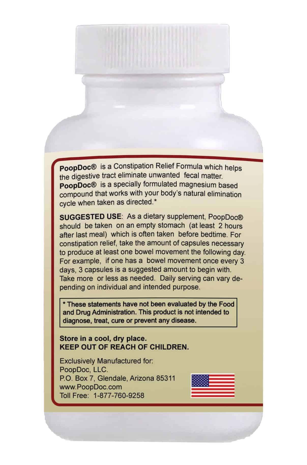 PoopDoc® is a Constipation Relief Formula which helps the digestive tract eliminate unwanted fecal matter. PoopDoc® is a specially formulated magnesium based compound that works with your body’s natural elimination cycle when taken as directed.